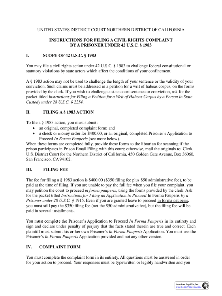 UNITED STATES DISTRICT COURT NORTHERN DISTRICT OF CALIFORNIA INSTRUCTIONS FOR FILING A CIVIL RIGHTS COMPLAINT BY A PRISONER UNDER 42 U.S.C. 1983 I.SCOPE OF 42 U.S.C. 1983You may file a civil rights