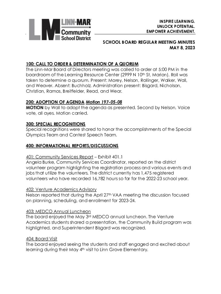 INSPIRE LEARNING. UNLOCK POTENTIAL. EMPOWER ACHIEVEMENT.SCHOOL BOARD REGULAR MEETING MINUTES MAY 8, 2023 100: CALL TO ORDER & DETERMINATION OF A QUORUM The LinnMar Board of Directors meeting was called