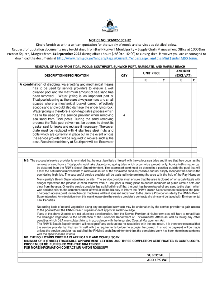 NOTICE NO .SCM02130922 Kindly furnish us with a written quotation for the supply of goods and services as detailed below. Request for quotation documents may be obtained from Ray Nkonyeni Municipality