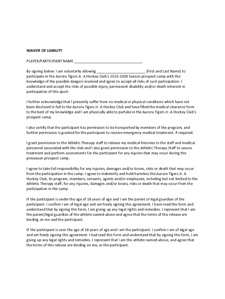 WAIVER OF LIABILITY PLAYER/PARTICIPANT NAME ___ By signing below: I am voluntarily allowing ___ (First and Last Name) to participate in the Aurora Tigers Jr. A Hockey Clubs 20232024 Season prospect