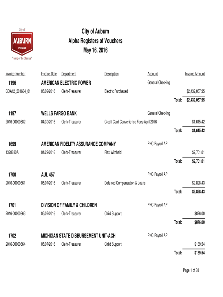 COA12_201604_01Invoice DateDepartmentDescriptionClerkTreasurerInvoice AmountGeneral CheckingAMERICAN ELECTRIC POWER
