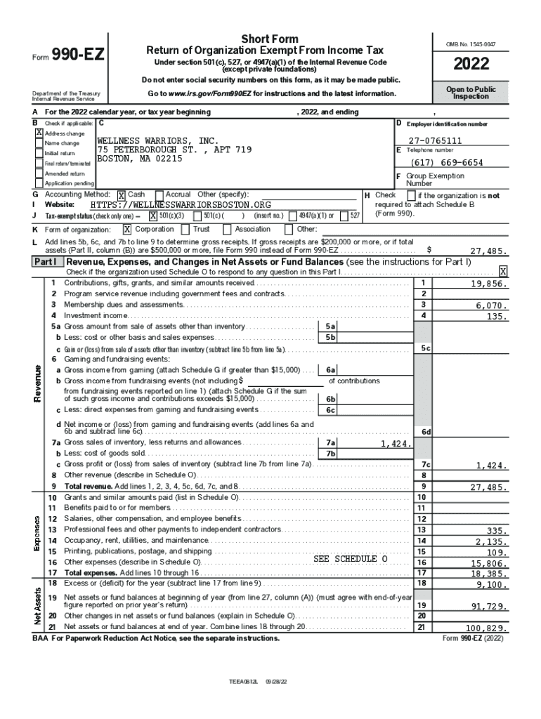 Form990EZDepartment of the Treasury Internal Revenue ServiceShort Form Return of Organization Exempt From Income TaxFor the 2022 calendar year, or tax year beginning Check if applicable:Name change