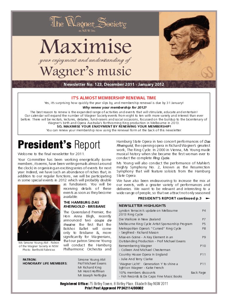 Wagner Society in NSW Inc.Maximiseyour enjoyment and understanding ofWagners music Newsletter No. 123, December 2011 January 2012 IT\'S ALMOST MEMBERSHIP RENEWAL TIME Yes, its surprising how quickly