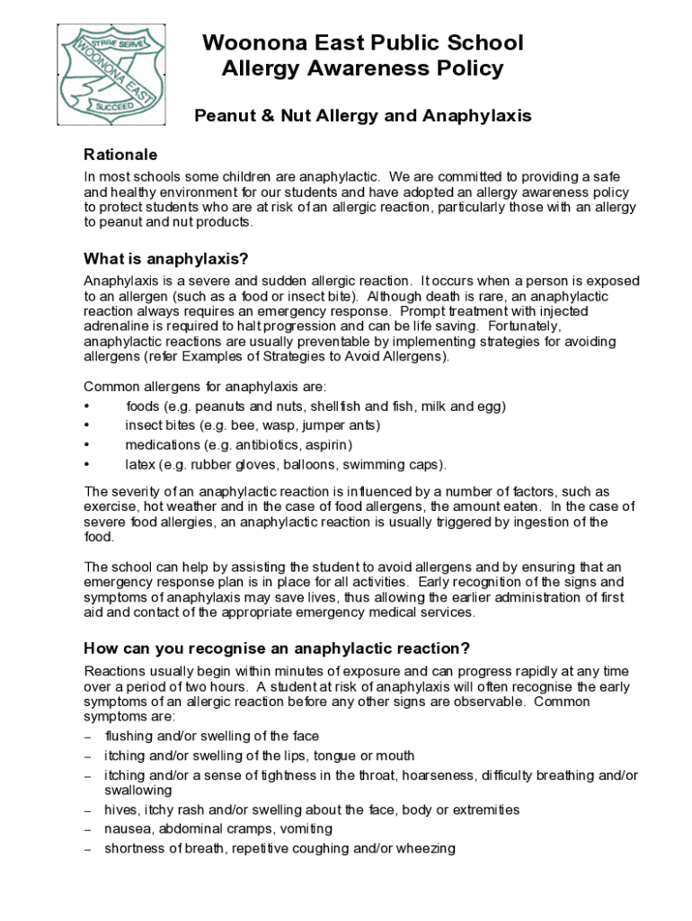 Woonona East Public School Allergy Awareness Policy Peanut & Nut Allergy and Anaphylaxis Rationale In most schools some children are anaphylactic. We are committed to providing a safe and healthy