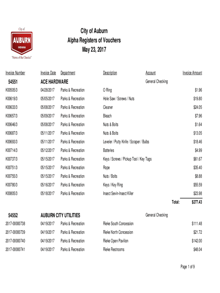 May 23, 2017Invoice Number54551Invoice DateDepartmentDescriptionAccountInvoice AmountGeneral Checking HARDWAREK00505/304/28/2017Parks & Recreation Ring$1.96K00619/305/05/2017Parks