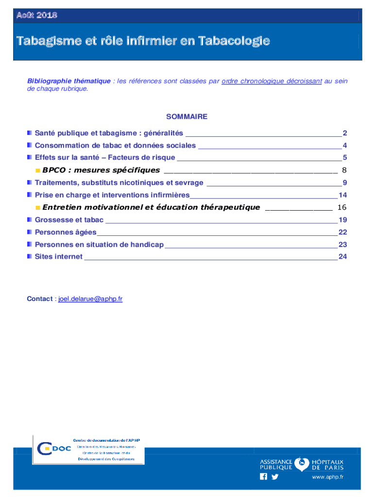 Aot 2018Tabagisme et rle infirmier en Tabacologie Bibliographie thmatique : les rfrences sont classes par ordre chronologique dcroissant au sein de chaque rubrique.SOMMAIRE Sant publique et tabagisme