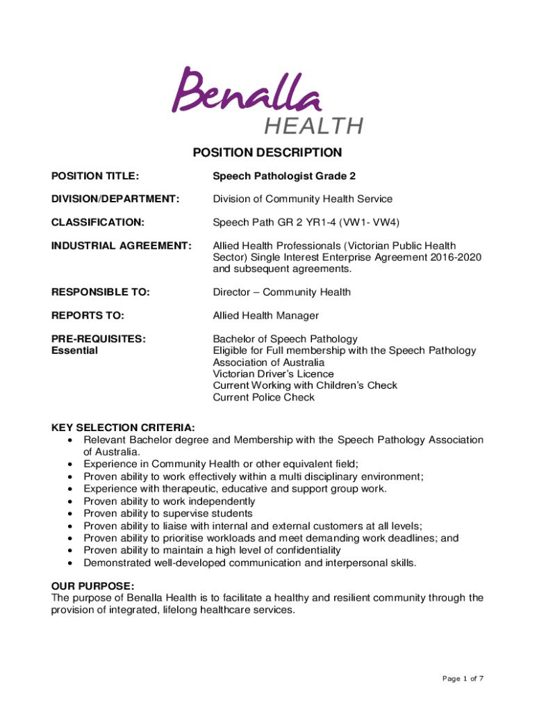 POSITION TITLE:Speech Pathologist Grade 2DIVISION/DEPARTMENT:Division of Community Health ServiceCLASSIFICATION:Speech Path GR 2 YR14 (VW1 VW4)INDUSTRIAL AGREEMENT:Allied Health