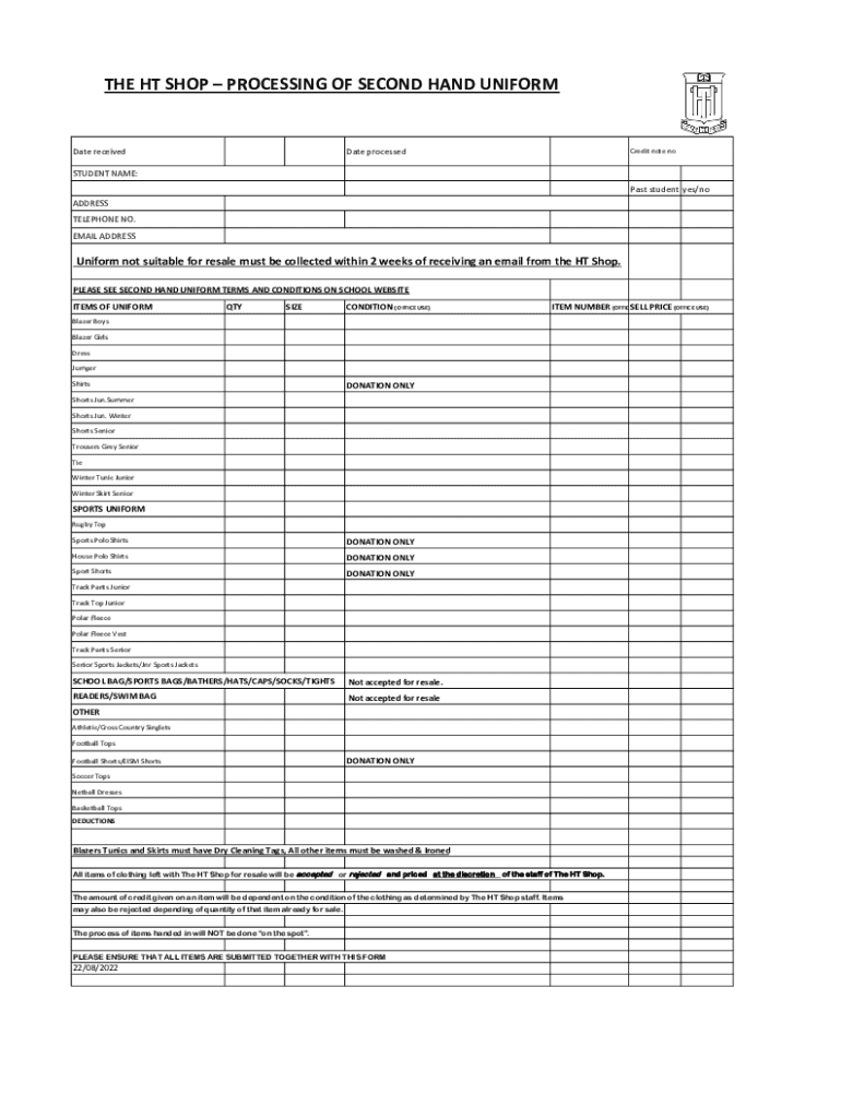 THEHTSHOPPROCESSINGOFSECONDHANDUNIFORMDatereceivedDateprocessedCreditnotenoSTUDENTNAME: Paststudent yes/no ADDRESS TELEPHONENO. EMAILADDRESSUniformnotsuitableforresalemustbecollectedwithin2weeksofreceivinganemailfromtheHTShop.