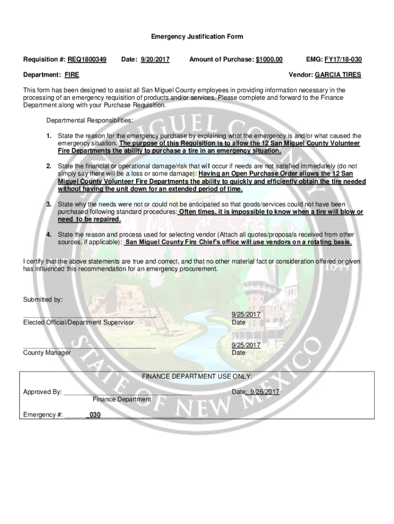 Get the free Emergency Justification Form Requisition #: REQ1800349 ... - co sanmiguel nm