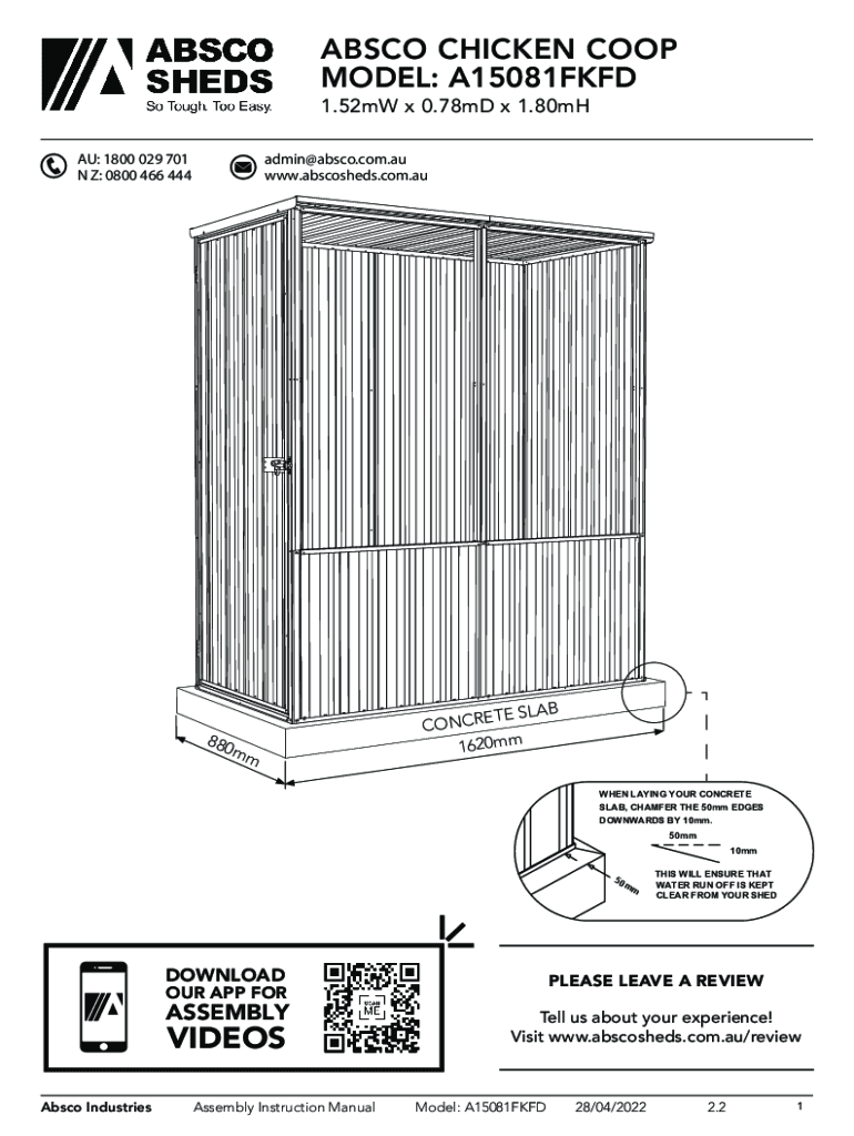 ABSCO CHICKEN COOP MODEL: A15081FKFD 1.52mW x 0.78mD x 1.80mH AU: 1800 029 701 N Z: 0800 466 444admin@absco.com.au www.abscosheds.com.au880mmB ETE SLA CONCR 1620mm WHEN LAYING YOUR CONCRETE SLAB,