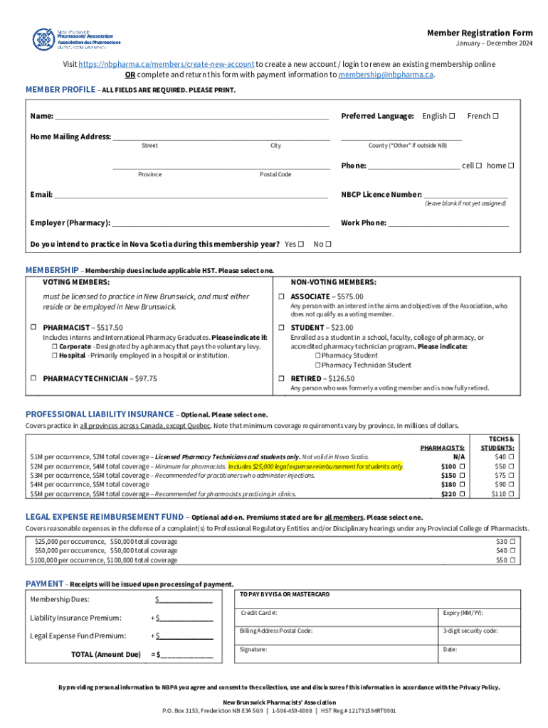 Member Registration Form January December 2024Visit https://nbpharma.ca/members/createnewaccount to create a new account / login to renew an existing membership online OR complete and return this