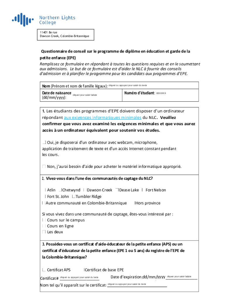 Dawson Creek, ColombieBritanniqueQuestionnaire de Conrail SUR LE program de diploma en education et garden de la
