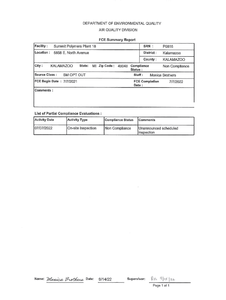DEPARTMENT OF ENVIRONMENTAL QUALITY AIR QUALITY DIVISION FCE Summary Report Facility:Summit Polymers Plant 18SRN :P0815Location:5858 E. North AvenueDistrict:KalamazooCounty:KALAMAZOOCity:KALAMAZOOState:Ml
