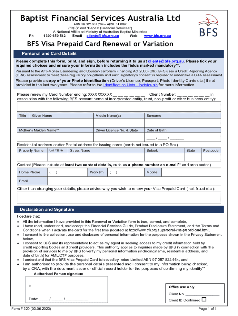 Get the free BFS Visa Prepaid Card Renewal or Variation
