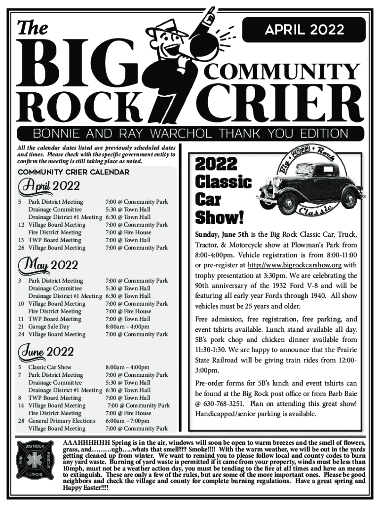 TheAPRIL 2022A******** pril 2022 5121326Park District MeetingDrainage CommitteeDrainage District #1 MeetingVillage Board MeetingFire District MeetingTWP Board MeetingVillage Board Meeting7:00 @ Community