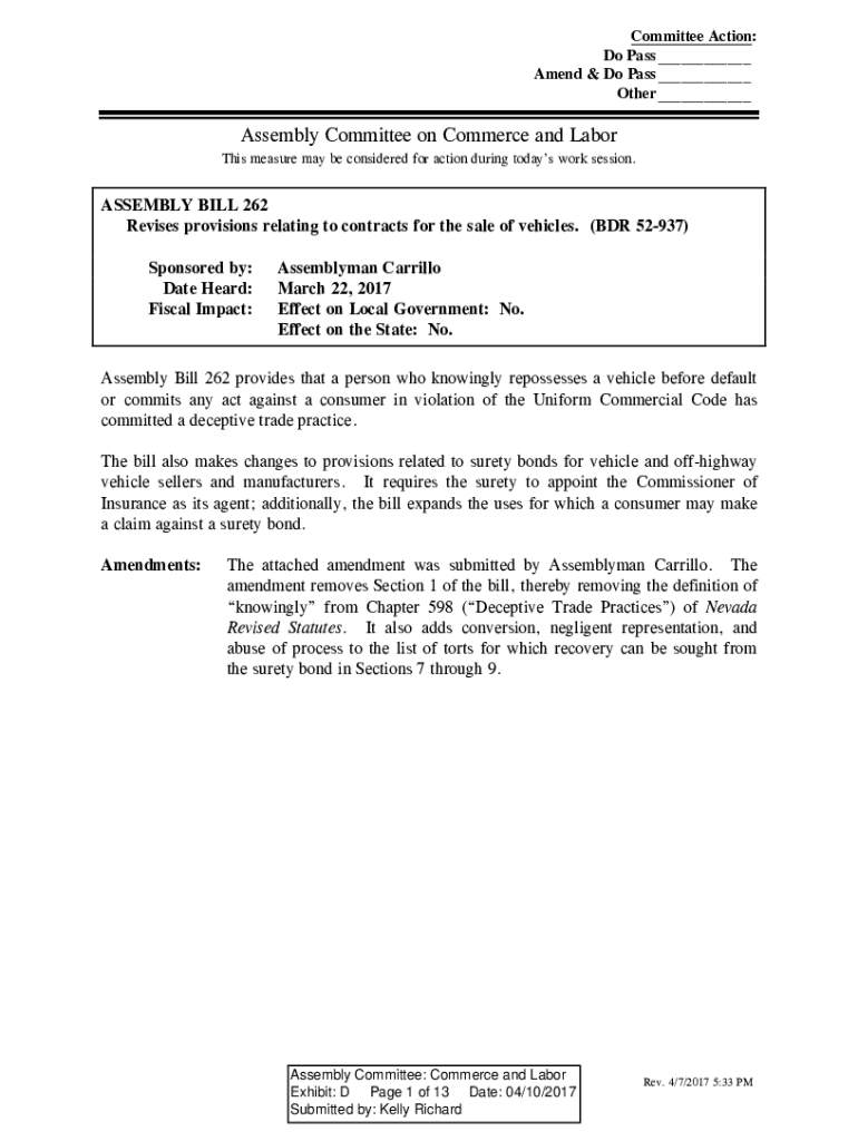 Committee Action: Do Pass ___ Amend & Do Pass ___ Other ___Assembly Committee on Commerce and Labor This measure may be considered for action during todays work session.ASSEMBLY BILL 262 Revises provisions