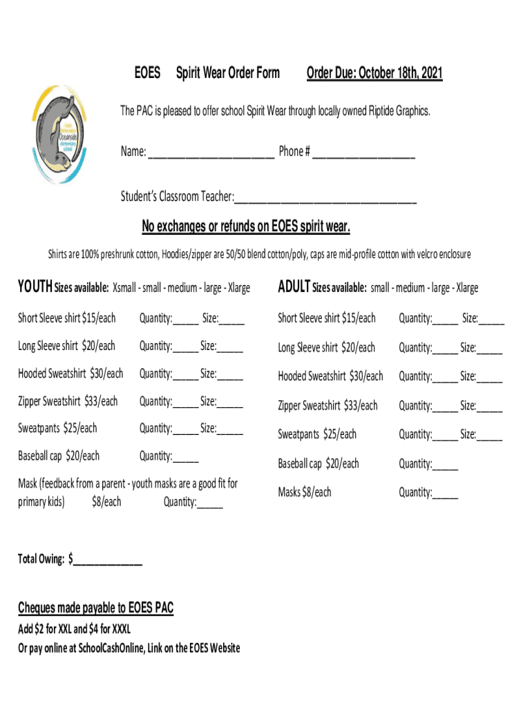 EOESSpirit Wear Order Forwarder Due: October 18th, 2021The PAC is pleased to offer school Spirit Wear through locally owned Riptide Graphics. Name: ___ Phone # ___
