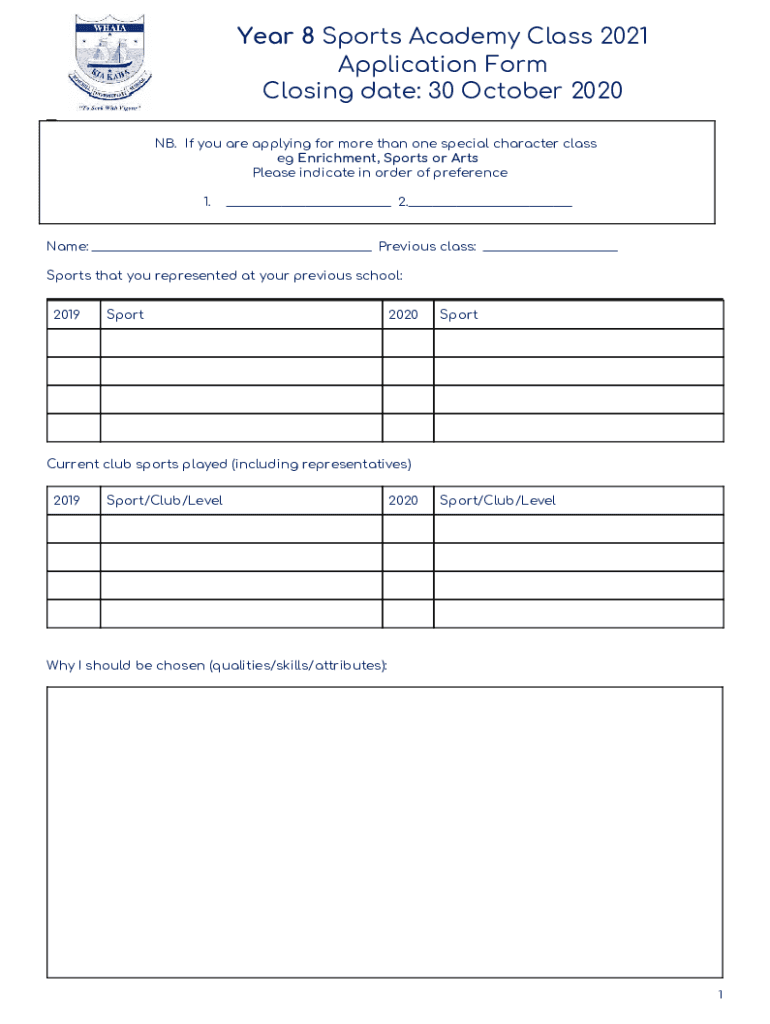 Year 8 Sports Academy Class 2021 Application Form Closing date: 30 October 2020 NB. If you are applying for more than one special character class e.g. Enrichment, Sports or Arts Please indicate in