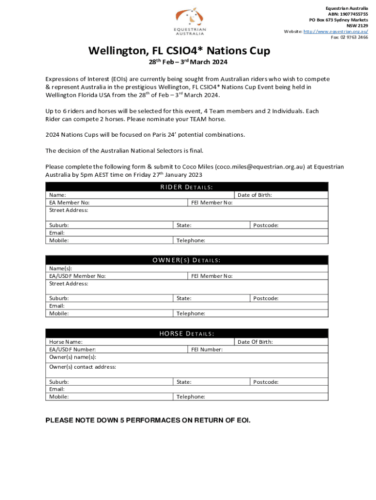 Equestrian Australia ABN: 19077455755 PO Box 673 Sydney Markets NSW 2129 Website: http://www.equestrian.org.au/ Fax: 02 9763 2466Wellington, FL CSIO4* Nations Cup 28th Feb 3rd March 2024 Expressions