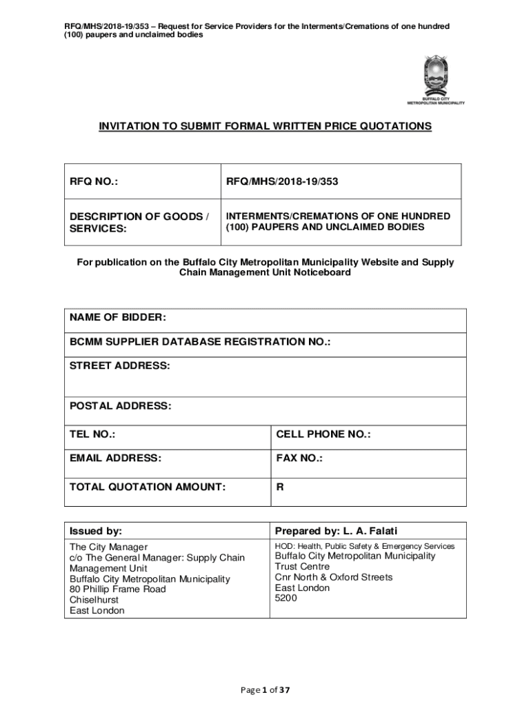 RFQ/MHS/201819/353 Request for Service Providers for the Interments/Cremations of one hundred (100) paupers and unclaimed bodiesINVITATION TO SUBMIT FORMAL WRITTEN PRICE QUOTATIONSRFQ NO.:RFQ/MHS/201819/353DESCRIPTION