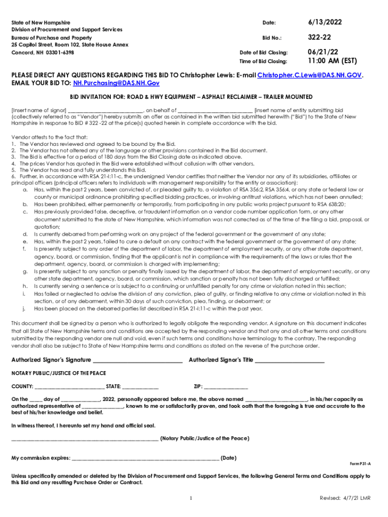 Get the free BID INVITATION FOR: ROAD & HWY EQUIPMENT ASPHALT RECLAIMER TRAILER MOUNTED