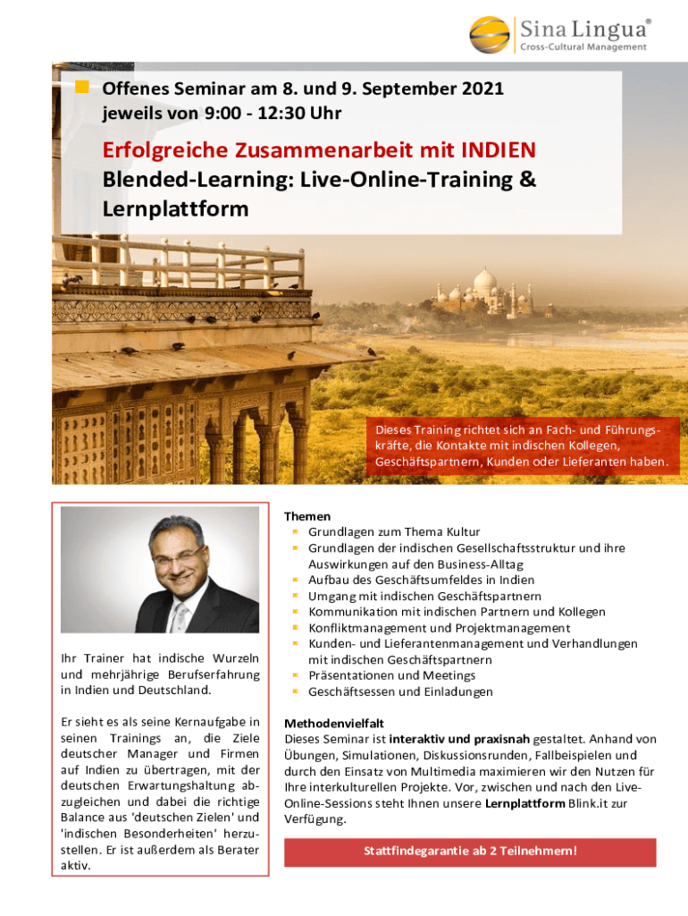 Offenes Seminar am 8. und 9. September 2021 jeweils von 9:00 12:30 UhrErfolgreiche Zusammenarbeit mit INDIEN BlendedLearning: LiveOnlineTraining & LernplattformDieses Training richtet sich an Fach