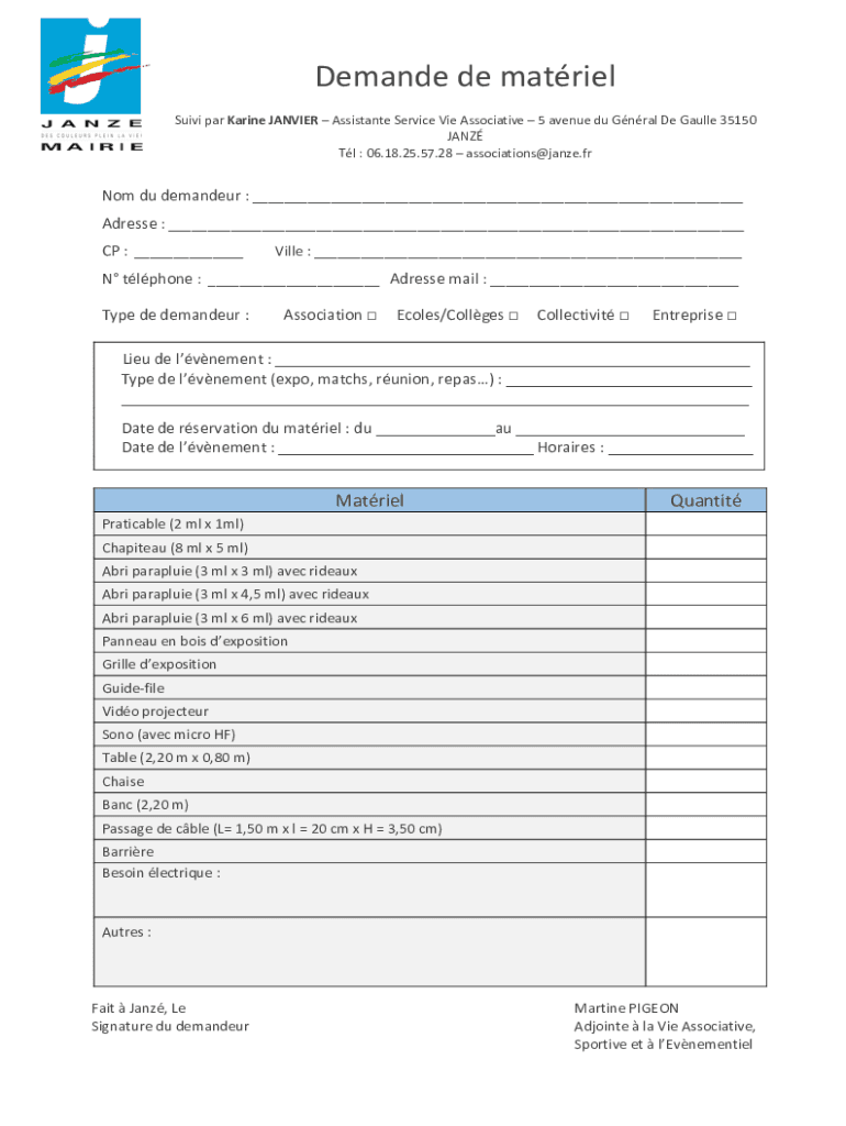 Demand de matrielSuivi par Marine JANVIER Assistance Service Vie Associative 5 avenue Du Gnarl De Gaulle 35150