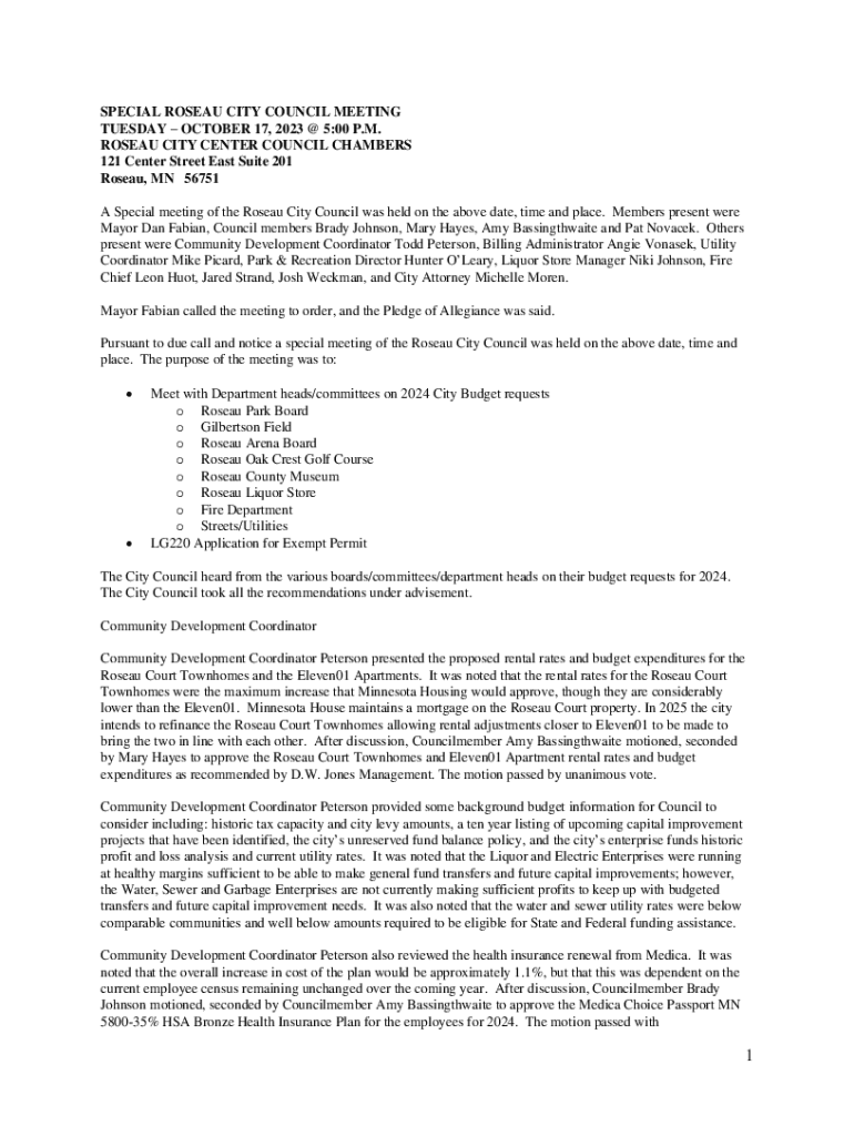 SPECIAL ROSEAU CITY COUNCIL MEETING TUESDAY OCTOBER 17, 2023 @ 5:00 P.M. ROSEAU CITY CENTER COUNCIL CHAMBERS 121 Center Street East Suite 201 Roseau, MN 56751 A Special meeting of the Roseau City