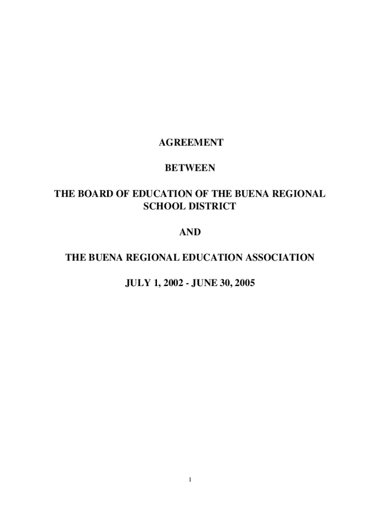 AGREEMENT BETWEEN THE BOARD OF EDUCATION OF THE BUENA REGIONAL SCHOOL DISTRICT AND THE BUENA REGIONAL EDUCATION ASSOCIATION JULY 1, 2002 JUNE 30, 20051TABLE OF CONTENTSTEACHING STAFF AGREEMENT PAGE
