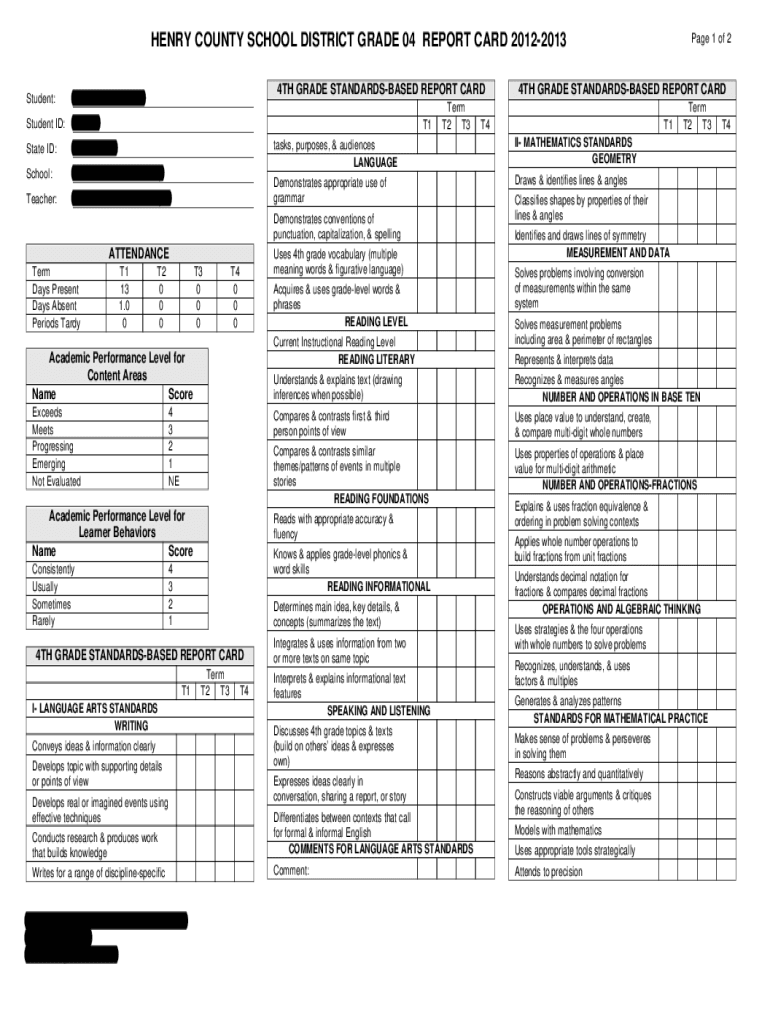HENRY COUNTY SCHOOL DISTRICT GRADE 04 REPORT CARD 20122013