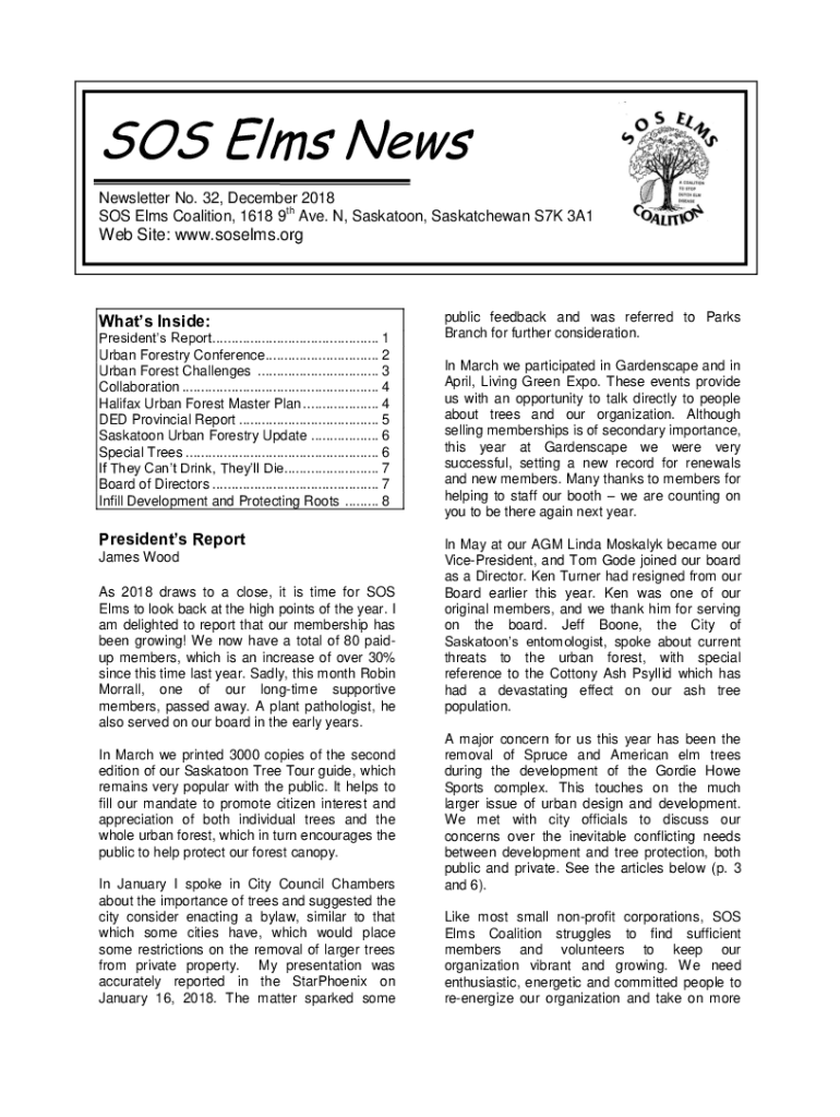 SOS Elms Coalition, 1618 9th Ave. N, Saskatoon, Saskatchewan S7K 3A1Web Site: www.soselms.orgWhats Inside: