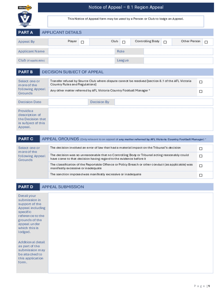 Get the free Notice of Appeal Form - 8.1 AFL Victoria Country Region Appeal.docx