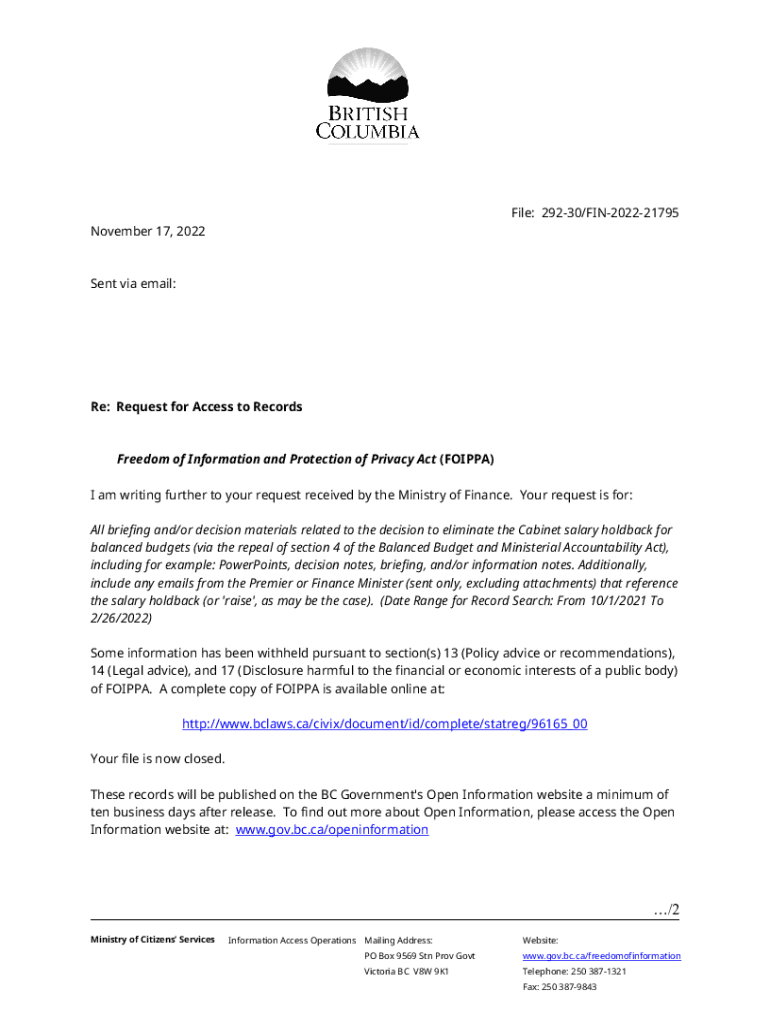 File: 29230/FIN202221795November 17, 2022Sent via email’Re: Request for Access to RecordsFreedom of Information and Protection of Privacy Act (POPPA)