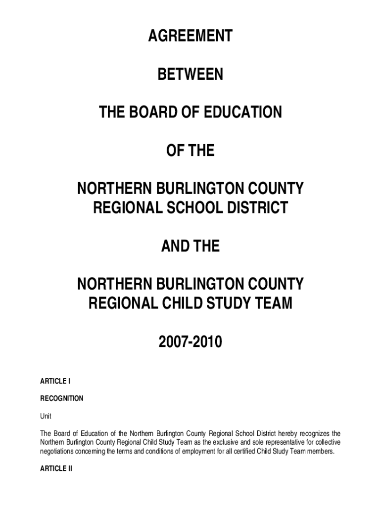 AGREEMENT BETWEEN THE BOARD OF EDUCATION OF THE NORTHERN BURLINGTON COUNTY REGIONAL SCHOOL DISTRICT AND THE NORTHERN BURLINGTON COUNTY REGIONAL CHILD STUDY TEAM 20072010 ARTICLE I RECOGNITION Unit