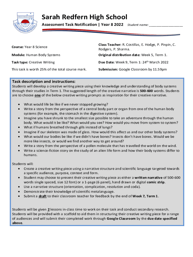 Assessment Task Notification | Year 8 2022Student name: ___Course: Year 8 ScienceClass Teacher: R. Costilla, E. Hodge, P. Pinyin, C.