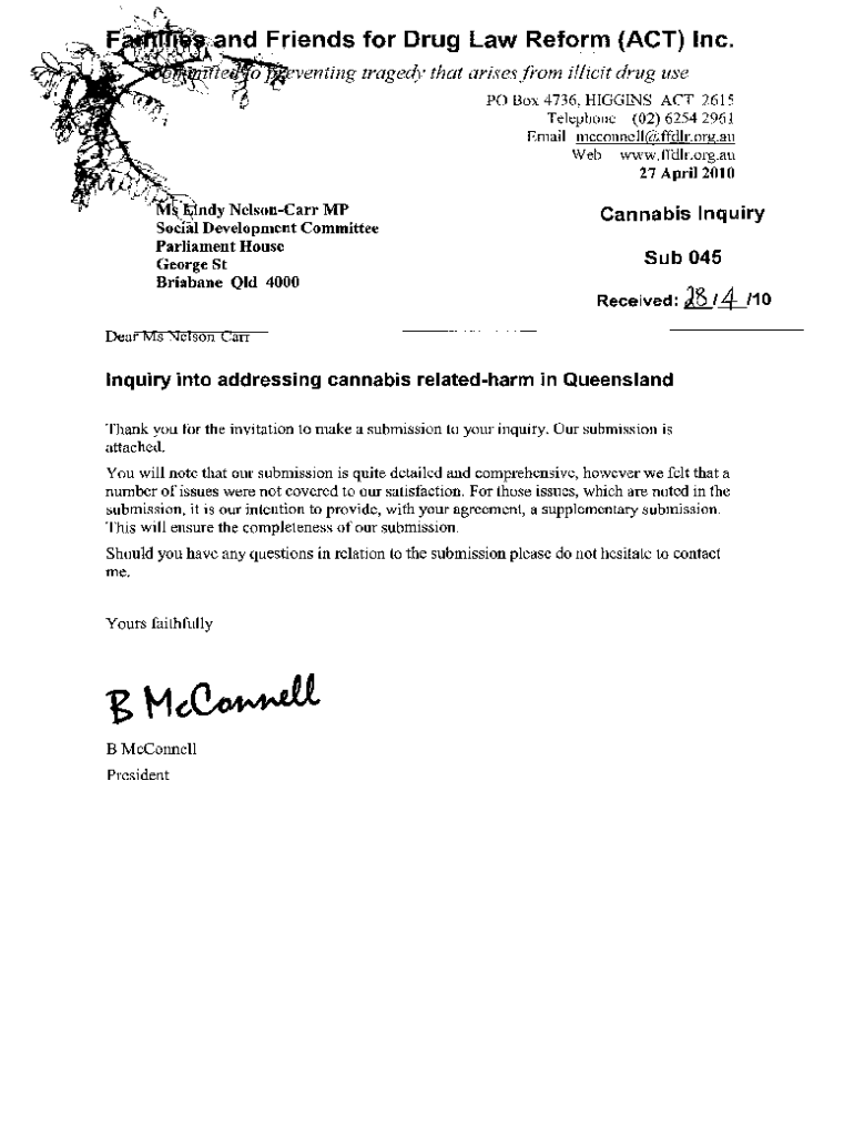 \": ?,and,, Friends for Drug Law Reform (ACT) Inc.:., 1feventing tragedy that arisesfiom illicit drug use t;JPO Box 4736, HIGGINS ACT 2615 Telephone (02) 6254 2961 Email mcconncll@ffdlr.org.au Web
