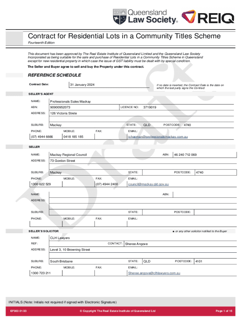 Contract for Residential Lots in a Community Titles Scheme Fourteenth Editions document has been approved by The Real Estate Institute of Queensland Limited and the Queensland Law Society Incorporated