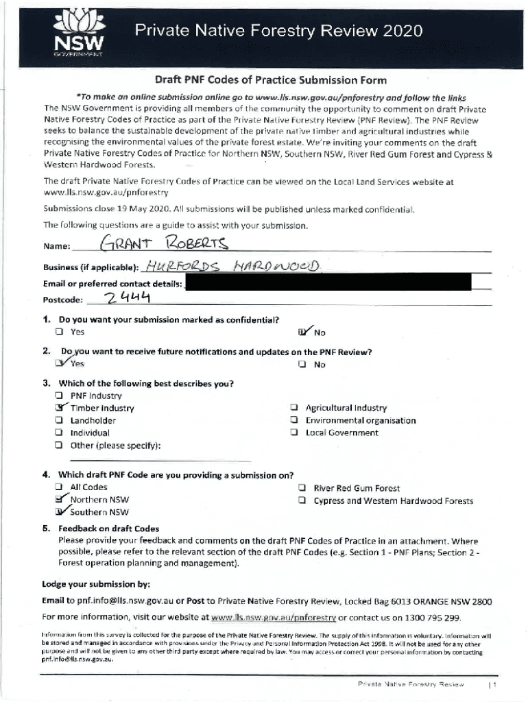 .,11.Ji NSWPrivate Native Forestry Review 2020GOVERNMEN,Draft PNF Codes of Practice Submission Form *To make an online submission online go to www.lls.nsw.gov.au/pnforestry and follow the lins The