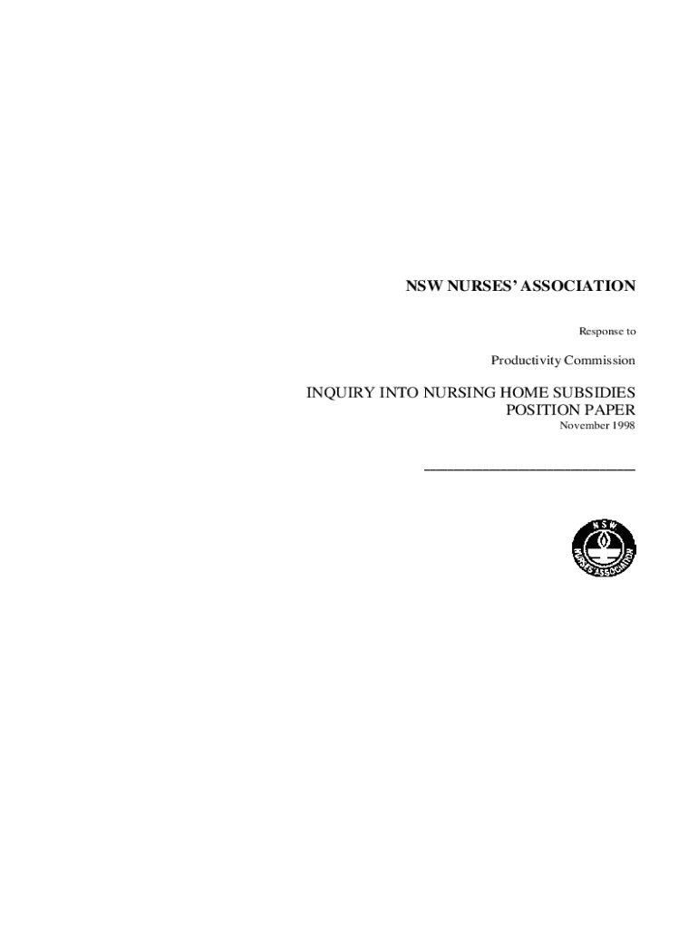 NSW NURSES ASSOCIATION Response toProductivity CommissionINQUIRY INTO NURSING HOME SUBSIDIES POSITION PAPER November 1998___NSW NURSES ASSOCIATION In Association with the Australian Nursing Federation