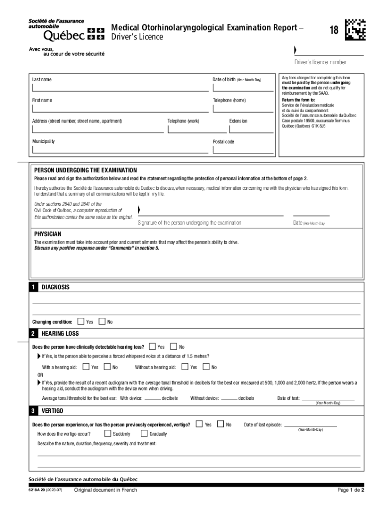 Medical Otorhinolaryngological Examination Report Drivers Licence18Drivers licence number Last nameDate of birth (YearMonthDay)Any fees charged for completing this form must be paid by the person