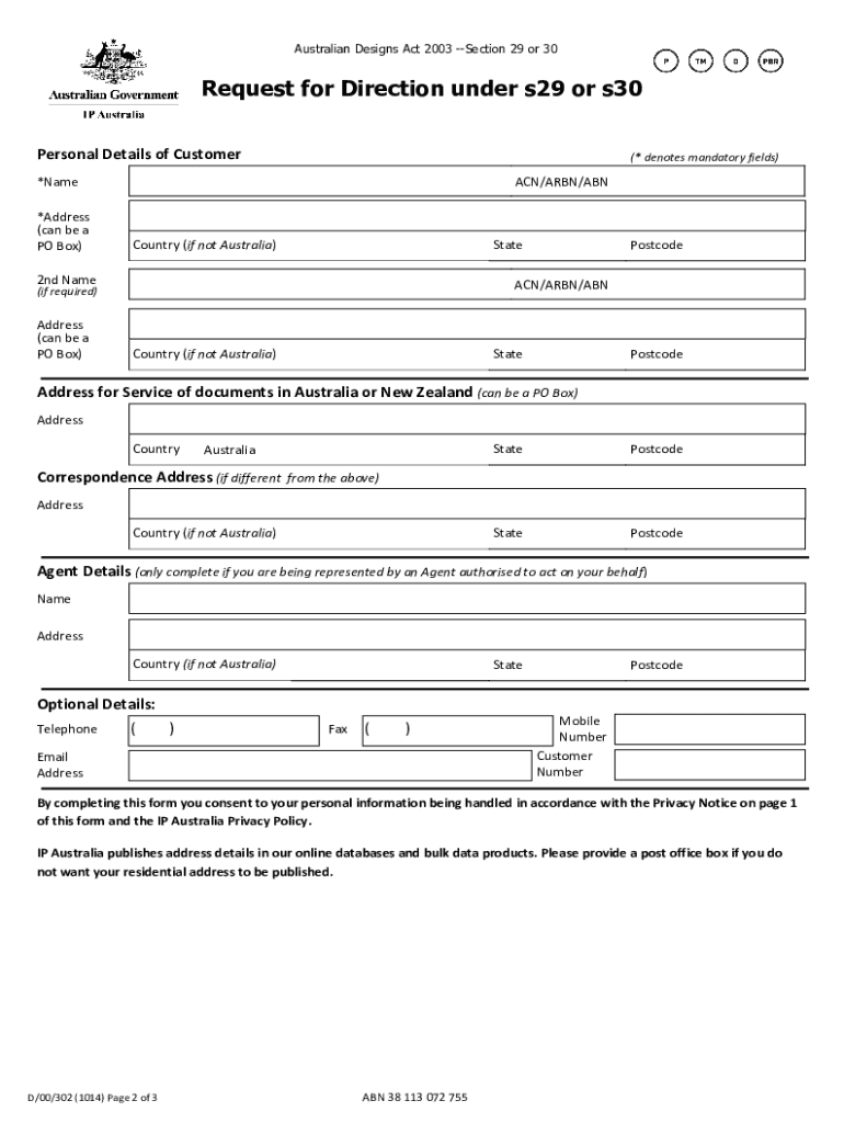 Australian Designs Act 2003, Section 29 or 30Request for Direction under s29 or s30 Privacy Notice The personal information collected on this form is collected for the purposes of the Designs Act