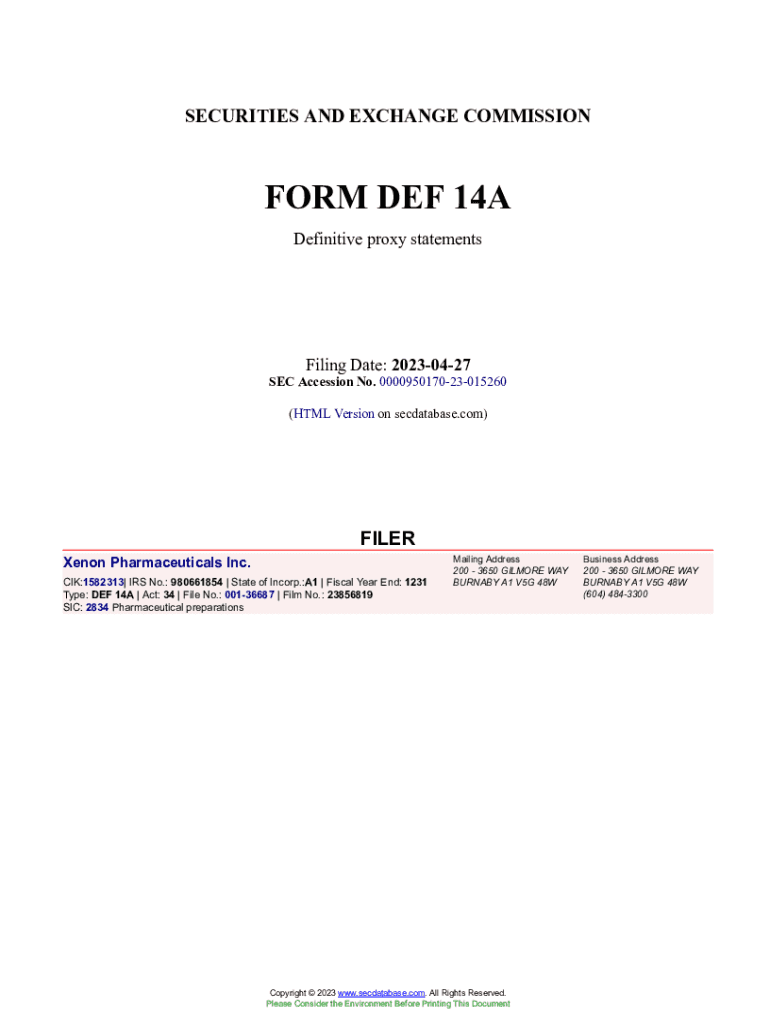 SECURITIES AND EXCHANGE COMMISSIONFORM DEF 14A Definitive proxy statementsFiling Date: 20230427SEC Accession No. 000095017023015260 (HTML Version on secdatabase.com)FILER Xenon Pharmaceuticals Inc.