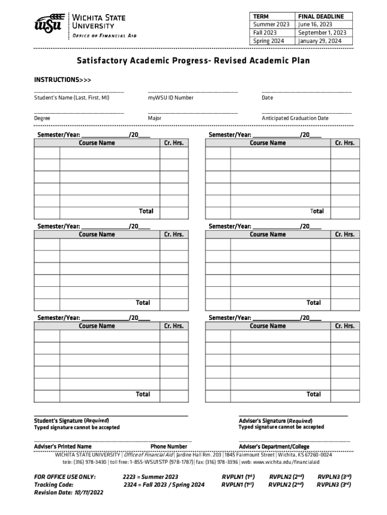 TERM Summer 2023 Fall 2023 Spring 2024FINAL DEADLINE June 16, 2023 September 1, 2023 January 29, 2024Satisfactory Academic Progress Revised Academic Plan INSTRUCTIONS ___ Students Name (Last, First,