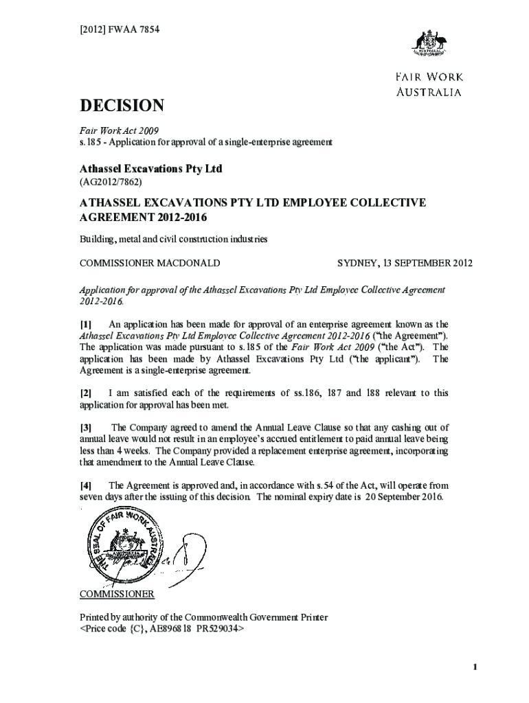 [2012] FWAA 7854DECISION Fair Work Act 2009 s.185 Application for approval of a singleenterprise agreementAthassel Excavations Pty Ltd (AG2012/7862)ATHASSEL EXCAVATIONS PTY LTD EMPLOYEE COLLECTIVE