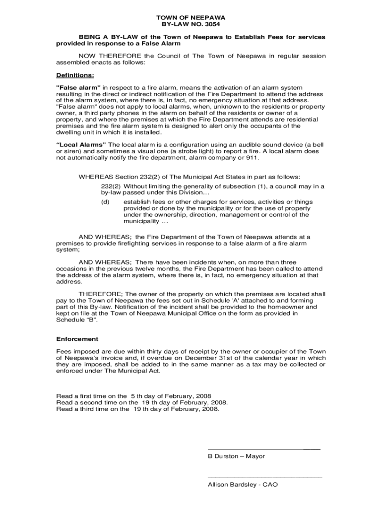 TOWN OF NEEPAWA BYLAW NO. 3054 BEING A BYLAW of the Town of Neepawa to Establish Fees for services provided in response to a False Alarm NOW THEREFORE the Council of The Town of Neepawa in regular