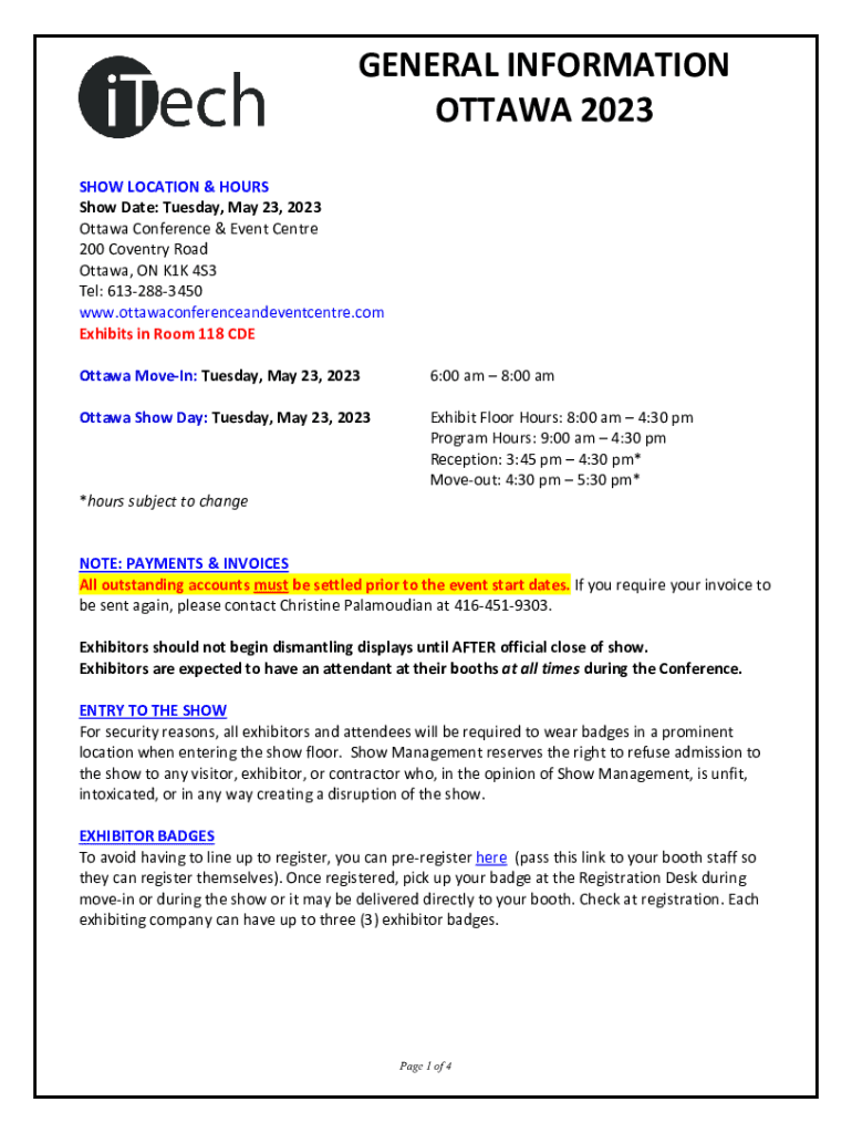 GENERAL INFORMATION OTTAWA 2023 SHOW LOCATION & HOURS Show Date: Tuesday, May 23, 2023 Ottawa Conference & Event Centre 200 Coventry Road Ottawa, ON K1K 4S3 Tel: 6132883450 www.ottawaconferenceandeventcentre.com