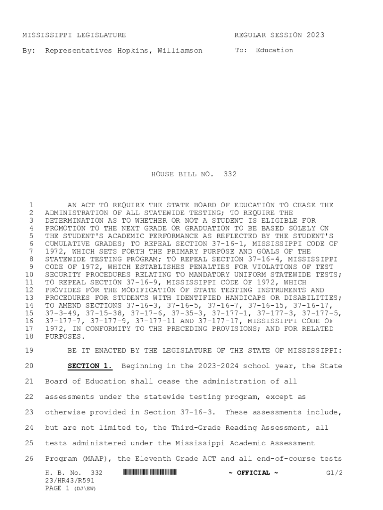 MISSISSIPPI LEGISLATUREREGULAR SESSION 2023By:To:Representatives Hopkins, WilliamsonHOUSE BILL NO.Education3321 2 3 4 5 6 7 8 9 10 11 12 13 14 15 16 17 18AN ACT TO REQUIRE THE STATE BOARD OF EDUCATION