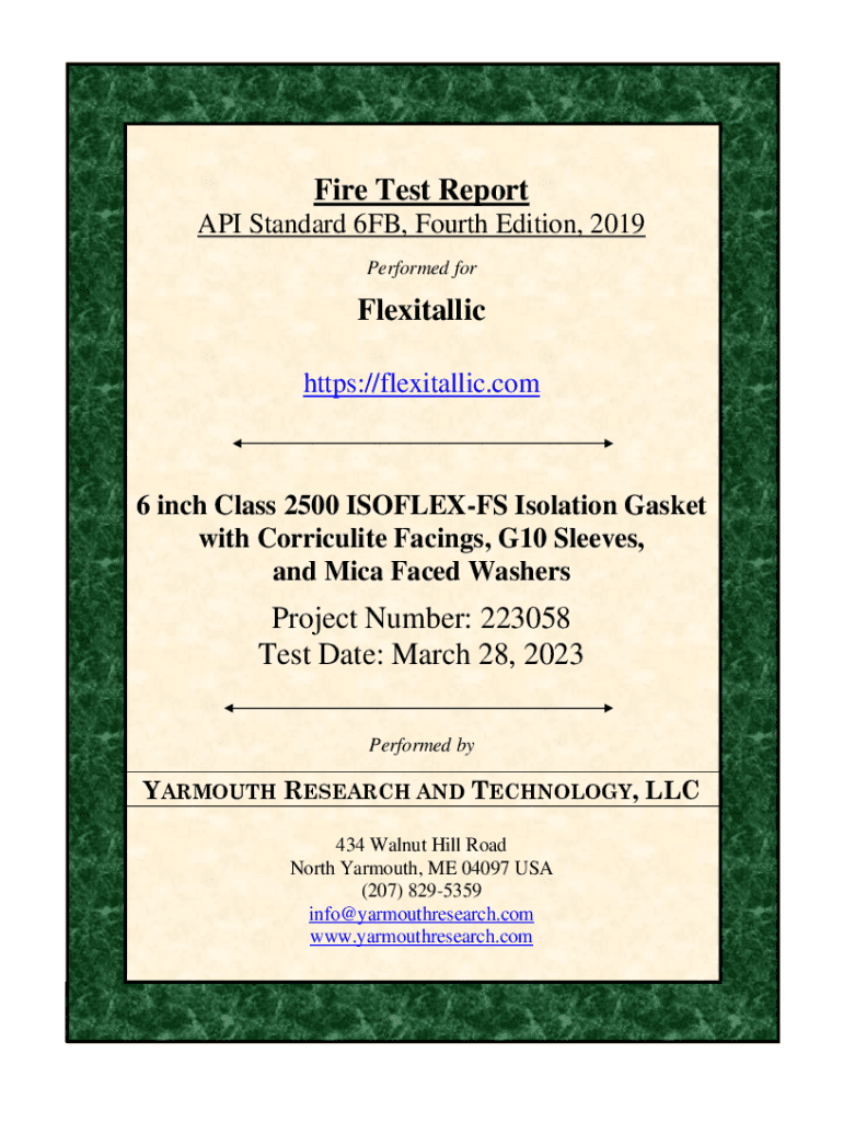 Fire Test Report API Standard 6FB, Fourth Edition, 2019 Performed forFlexitallic https://flexitallic.com6 inch Class 2500 ISOFLEXFS Isolation Gasket with Corriculite Facings, G10 Sleeves, and Mica