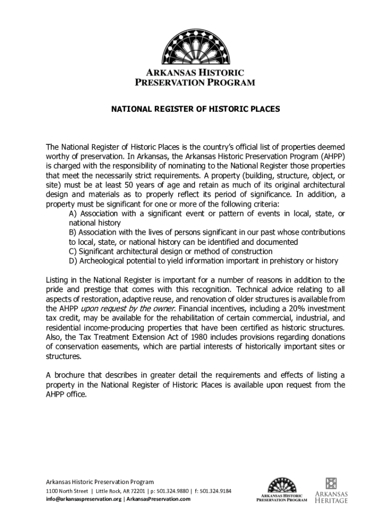 worthy of preservation. In Arkansas, the Arkansas Historic Preservation