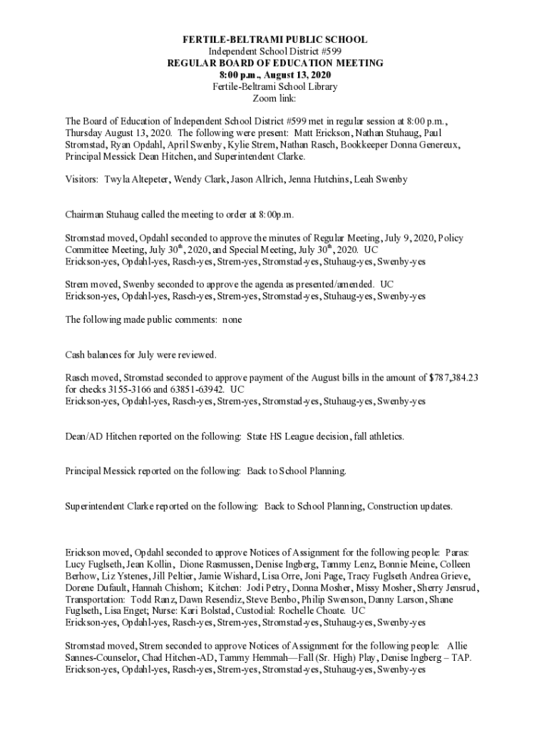 FERTILEBELTRAMI PUBLIC SCHOOL Independent School District #599 REGULAR BOARD OF EDUCATION MEETING 8:00 p.m., August 13, 2020 FertileBeltrami School Library Zoom link: The Board of Education of Independent